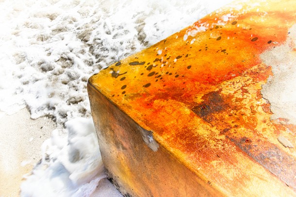Hier treffen zwei Welten aufeinander… Das flexible, anpassungsfähige Wasser umspült den starren, unbeweglichen Betonklotz, der trotz seiner plumpen Dominanz aufgrund seiner Farbenvielfalt eine Schönheit und Harmonie ins Bild bringt.